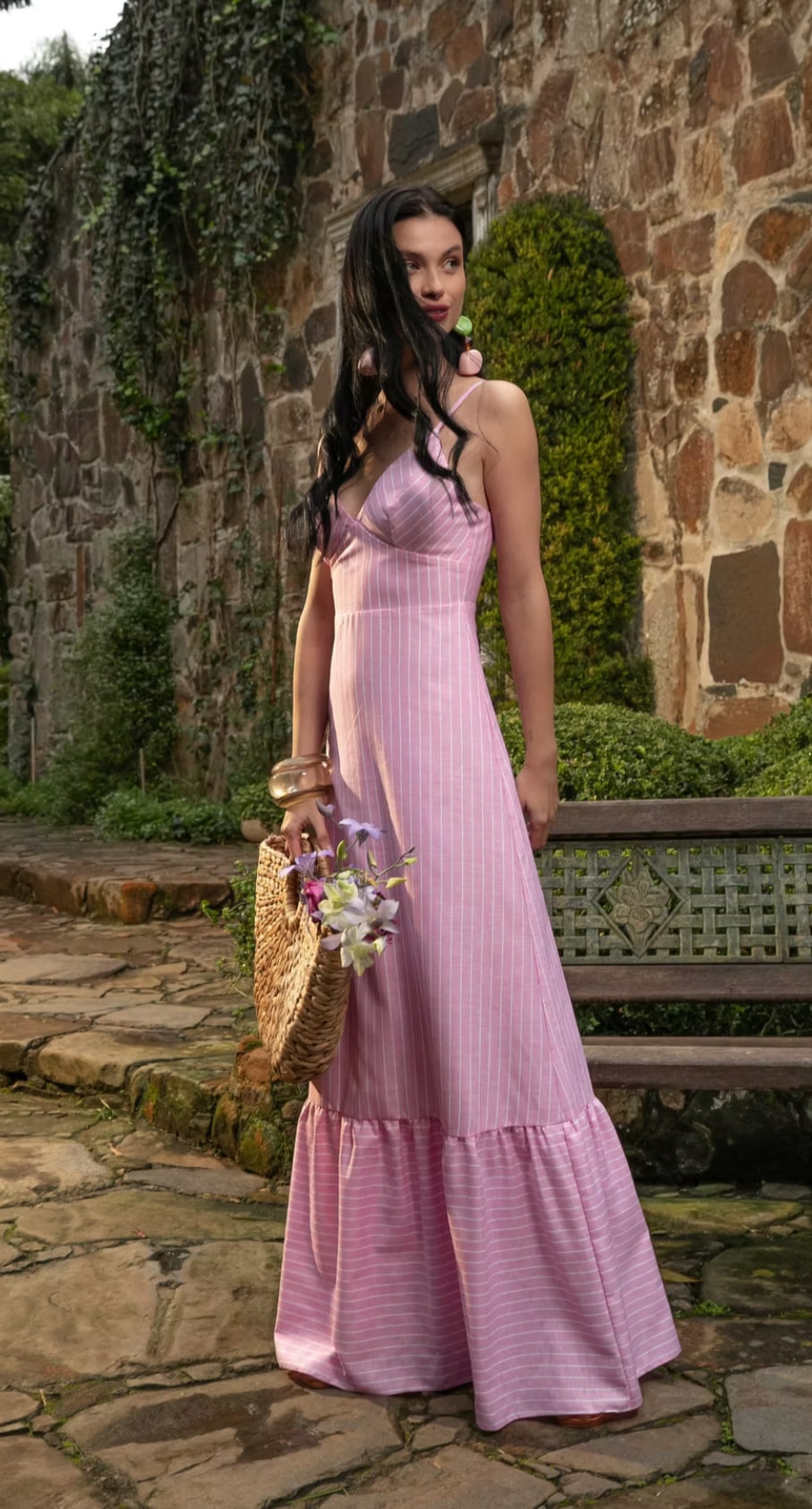 Vestido longo feminino com caimento leve e elegante. O tom rosa traz delicadeza e feminilidade, perfeito para eventos, celebrações e ocasiões especiais.