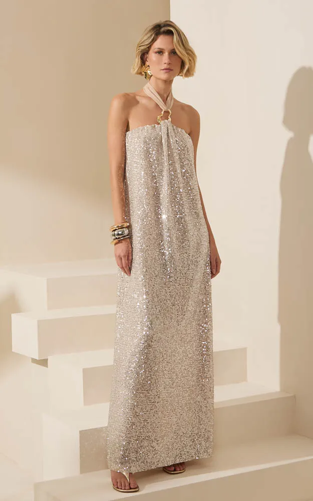Vestido longo feminino com recortes cavados que valorizam a silhueta de forma elegante. O tom prata confere sofisticação, sendo ideal para eventos noturnos e ocasiões especiais.