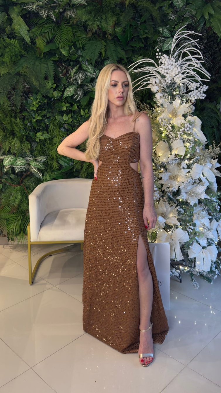 Vestido Feminino Longo Tela Paetê Marrom